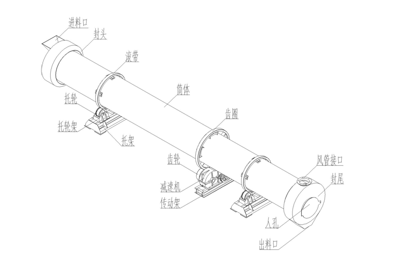 d.封頭、封尾、風(fēng)管、火管:該部分構(gòu)成了烘干機(jī)工作中所需的熱風(fēng)循環(huán)、除塵系統(tǒng)。封頭、封尾與機(jī)體接合處之間密封性良好,從而使熱風(fēng)不斷地帶走顆粒中所含的水分,達(dá)到均勻烘干顆粒的目的。操作人員需要進(jìn)入筒體內(nèi)部進(jìn)行作業(yè)時(shí),請(qǐng)?jiān)谕C(jī)情況下由檢修孔進(jìn)入。